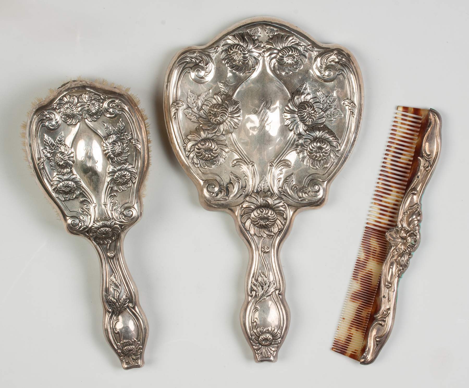Ornate Sterling Silver 3 Piece Dresser Set With Mega Mirror Hill